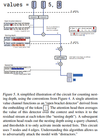 リストのネストの深さに応じて ] または ]] でリストを適切に閉じるタスク(bracket counting)の回路が分析されました。このタスクの回路は以下の3ステップで機能します。