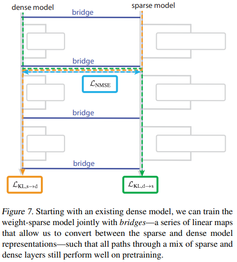 損失項:ブリッジは、スパースモデルの計算が密モデルの計算と一致するように訓練されます。この訓練では、通常の事前学習損失に加えて、以下の3つのブリッジ損失項が使用されます。
