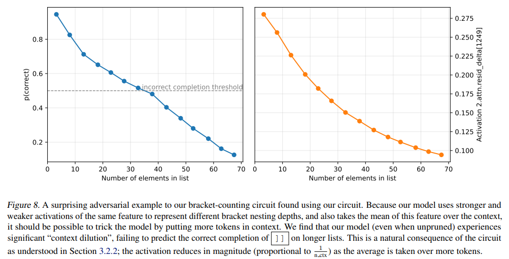 このメカニズム的な理解に基づき、コンテキスト内のトークン数を増やすとリストの深さを示す活性化のマグニチュードが「希釈」され、モデルが誤った予測をするという、自然な敵対的サンプル(Context Dilution)が発見されました。