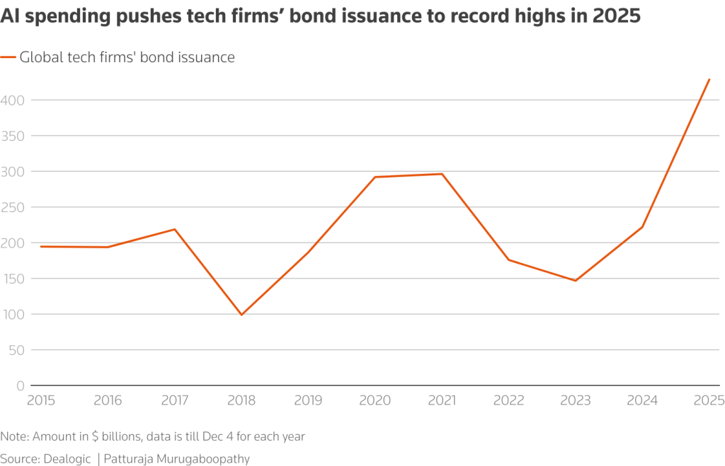 • グローバルテクノロジー企業は2025年12月第1週までに4283億ドルの債券を発行し、記録的な水準に達した